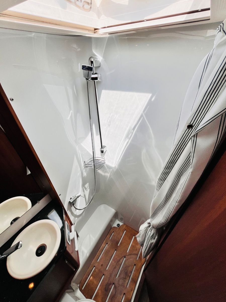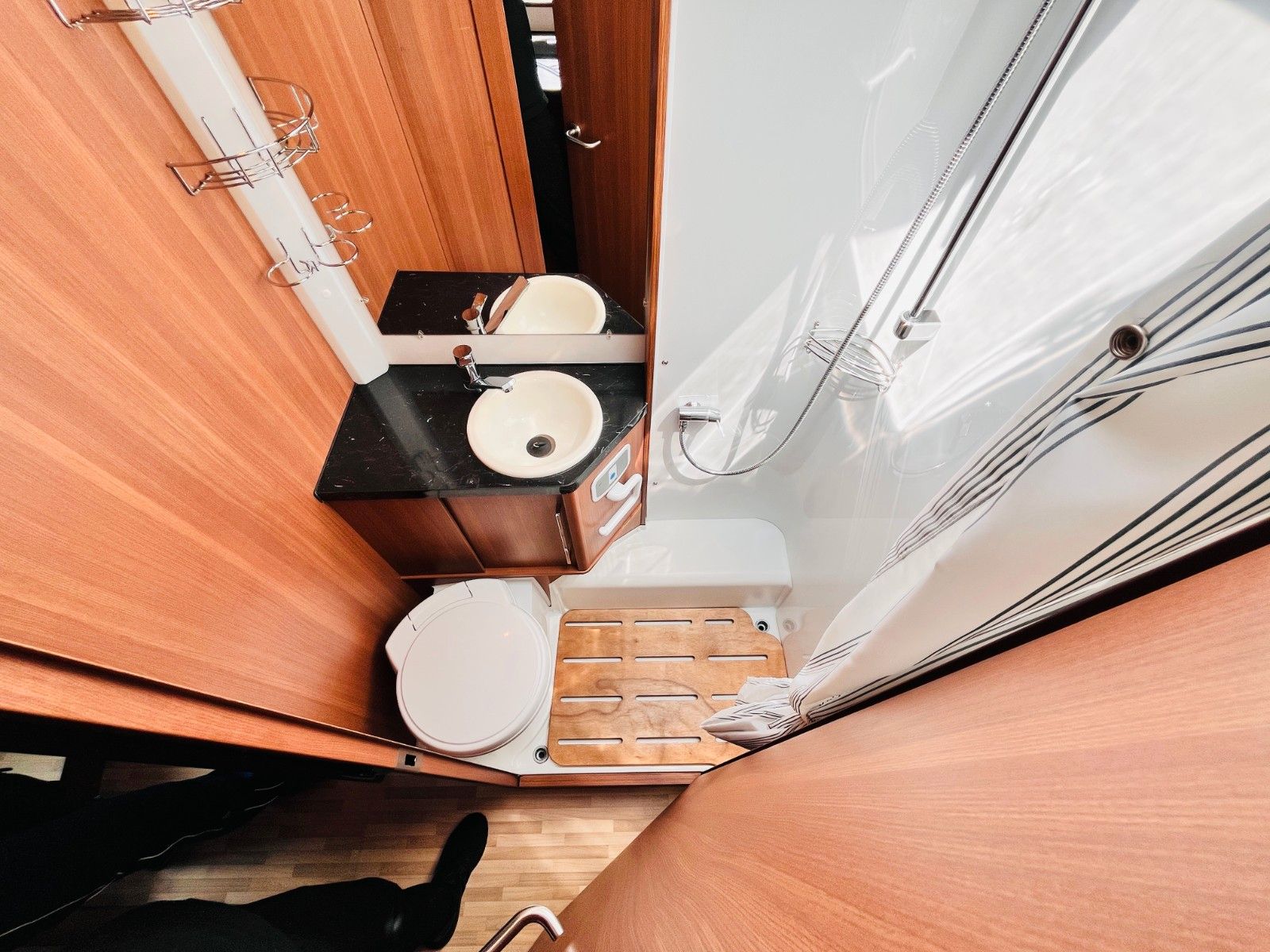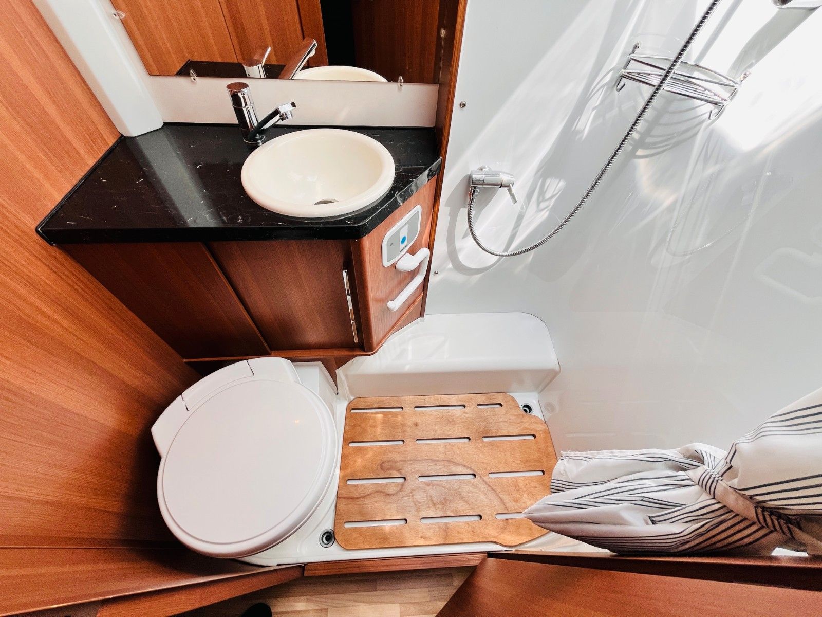 – Bad mit Dusche, Waschbecken und Thetford- Cassettentoilette