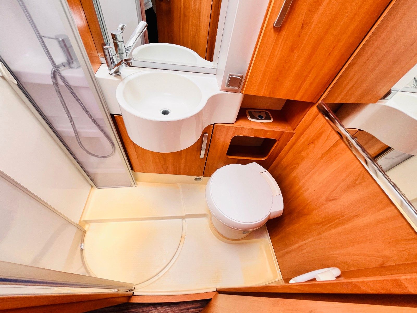 – Bad mit Dusche, Waschbecken und Thetford- Cassettentoilette