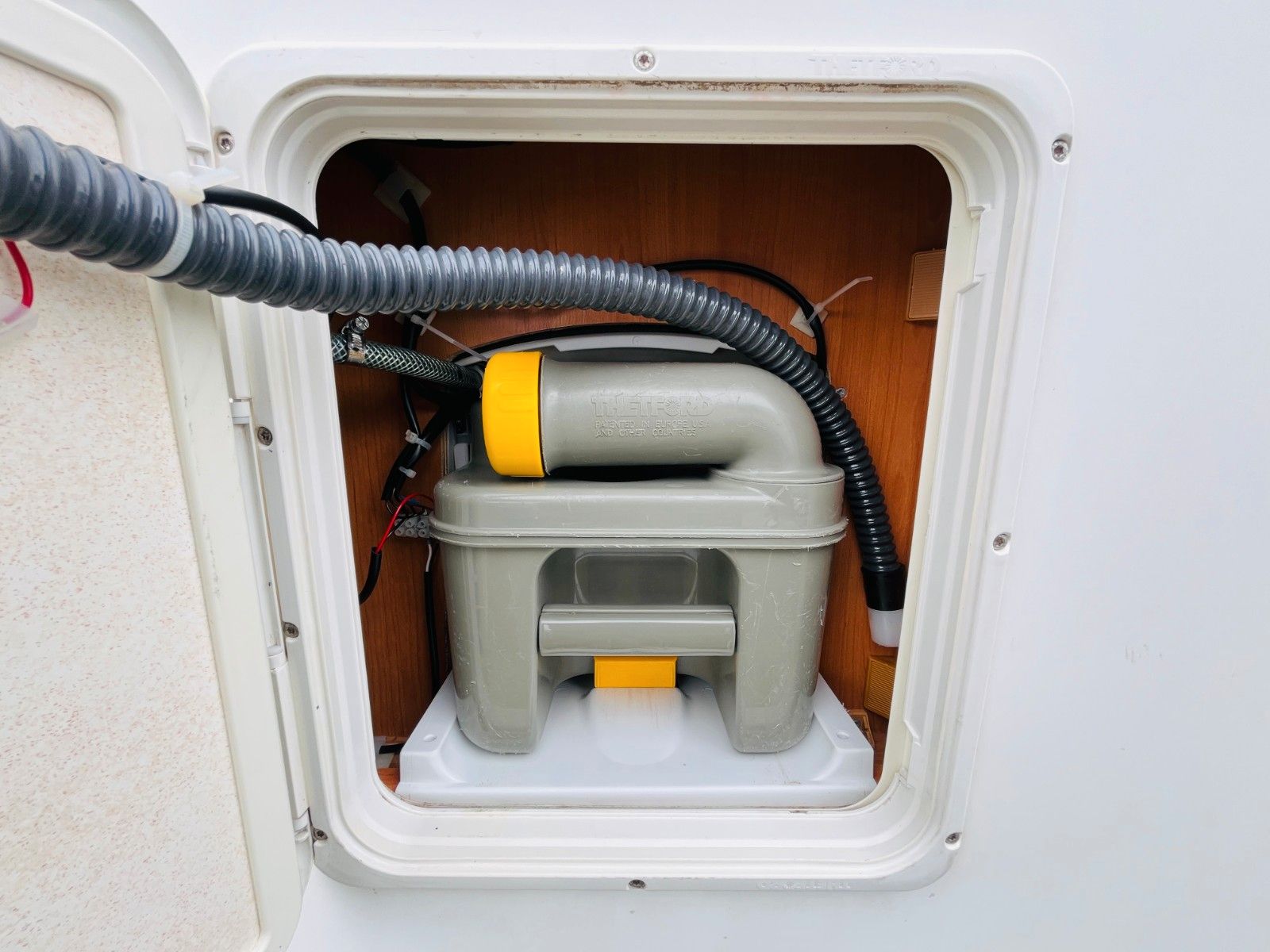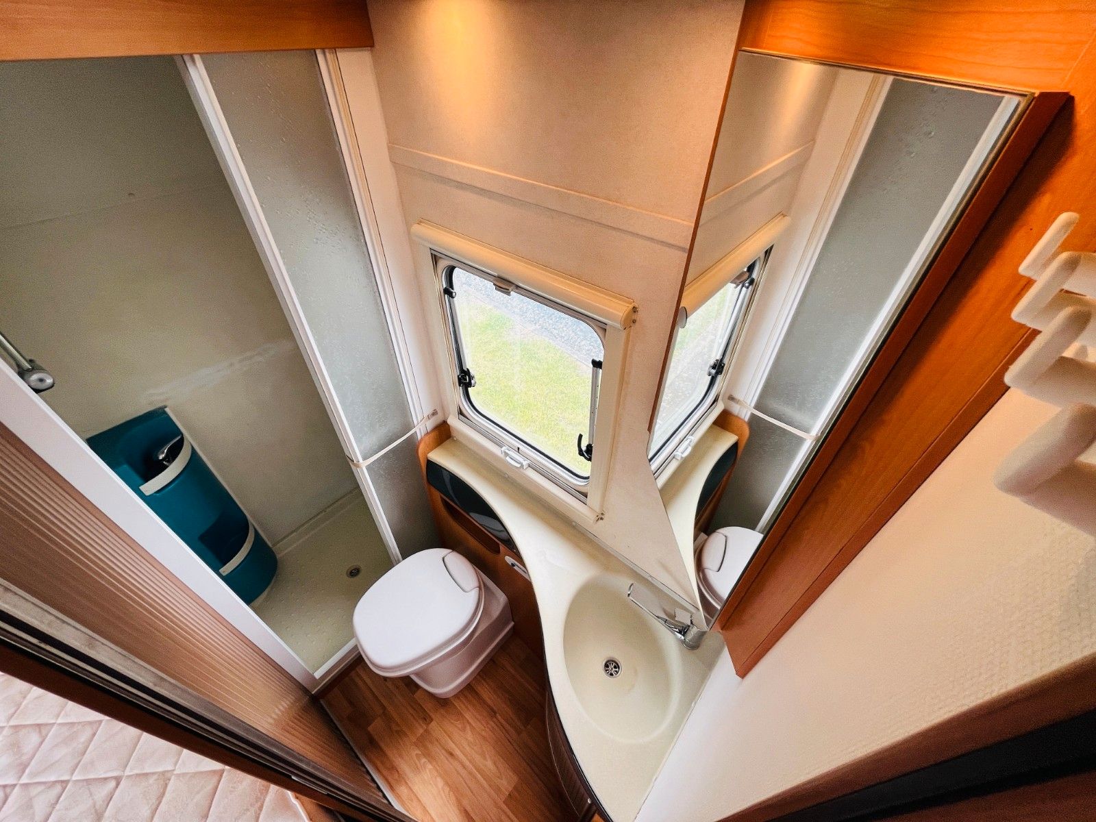 – Bad mit Waschbecken, Fenster, Dusche und Thetford- Cassettentoilette