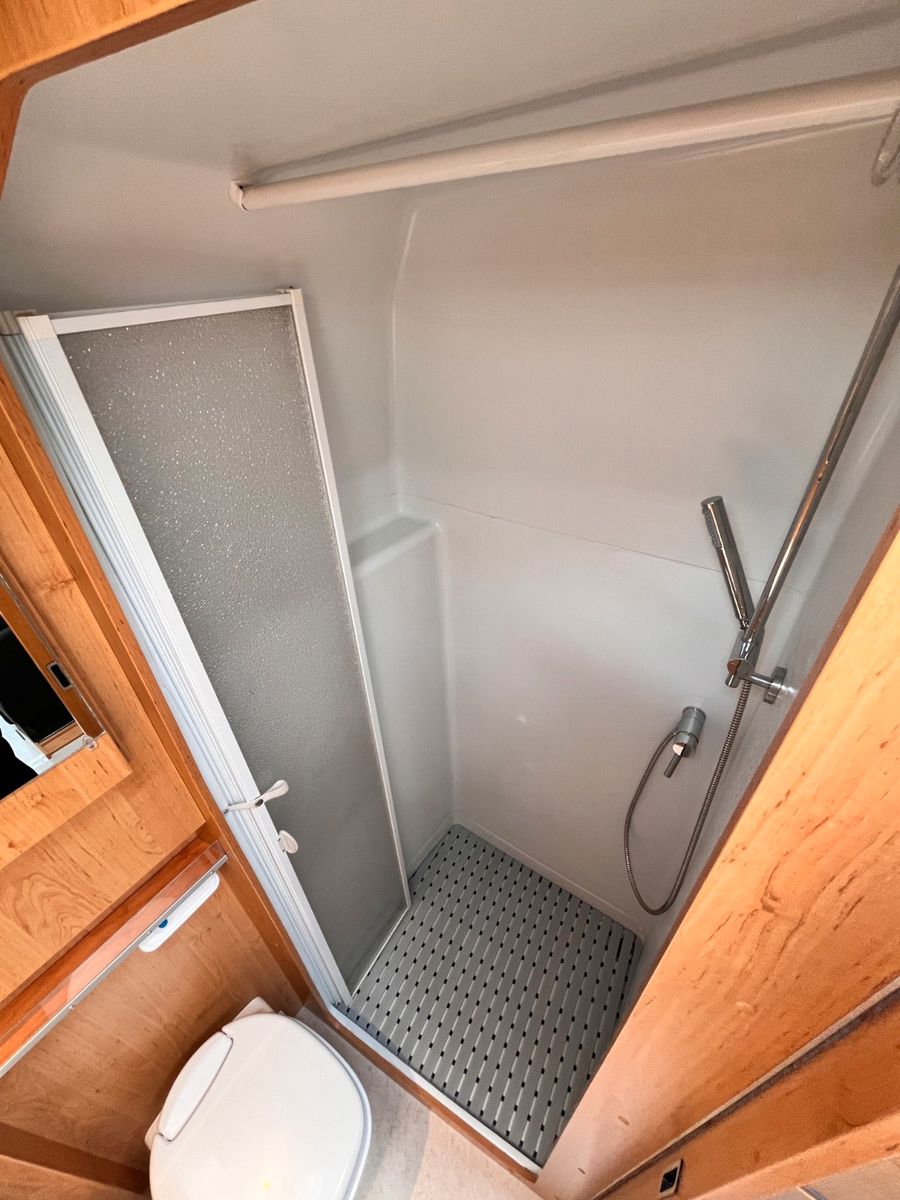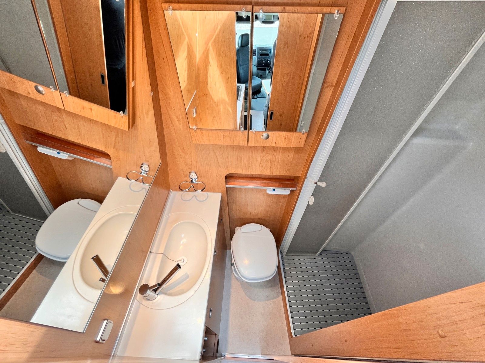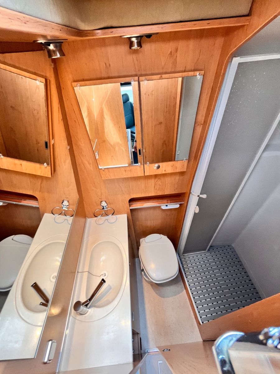 – Bad mit Waschbecken, Dusche und Thetford-Cassettentoilette