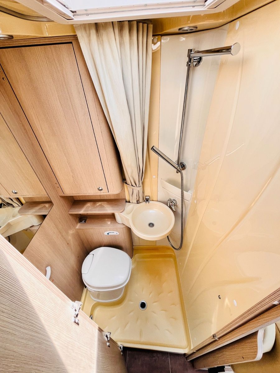 – Bad mit Waschbecken, Dusche und Thetford-Cassettentoilette