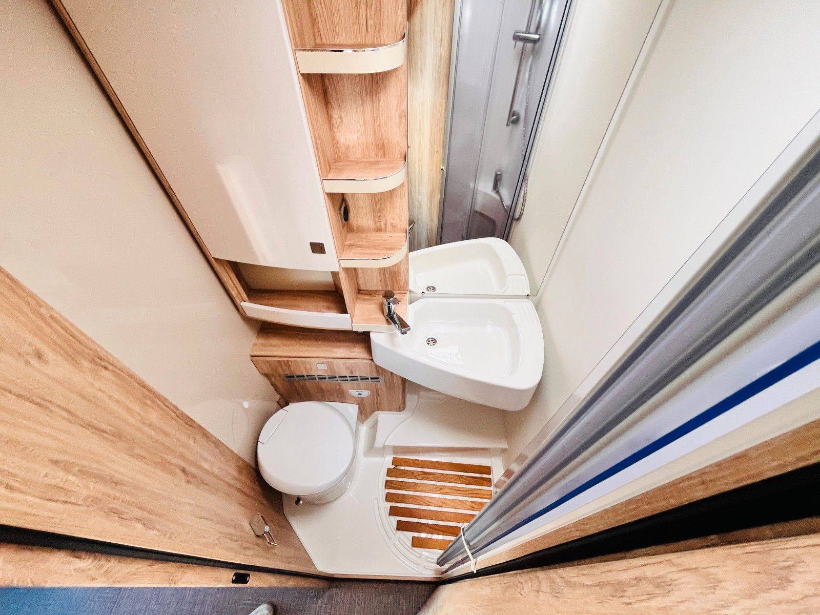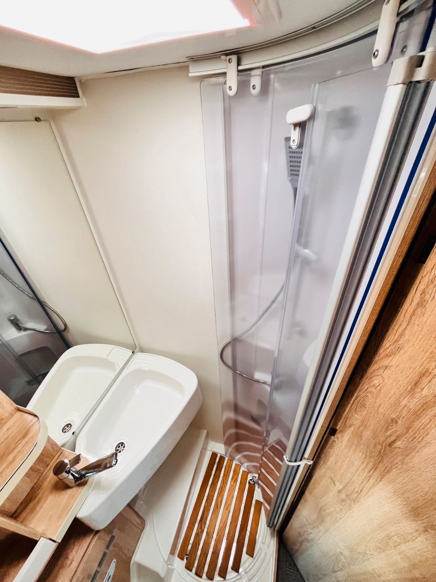 – Bad mit Dusche, Waschbecken und Thetford- Cassettentoilette