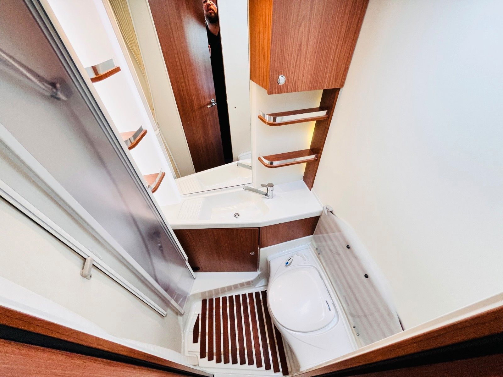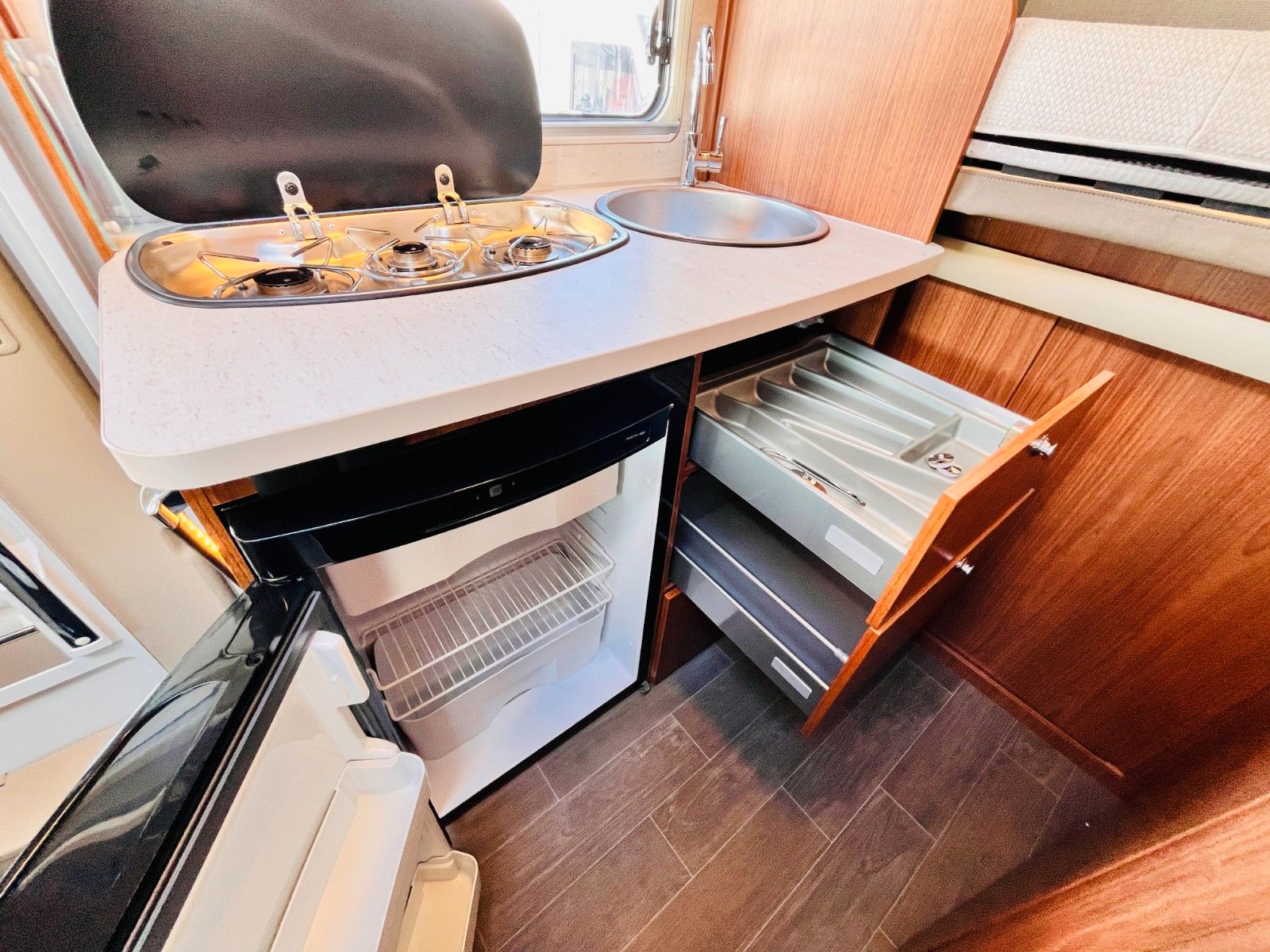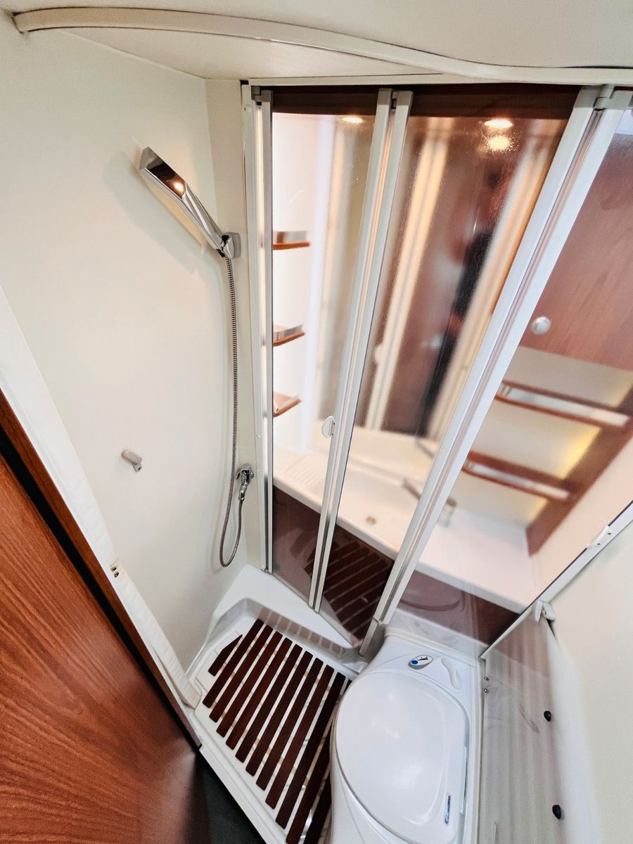 – Bad mit Waschbecken, Dusche und Thetford- Cassettentoilette