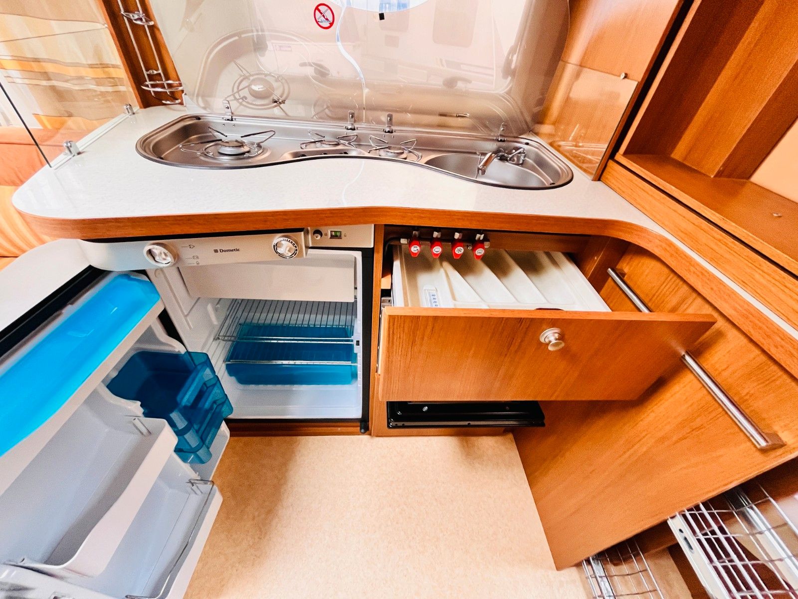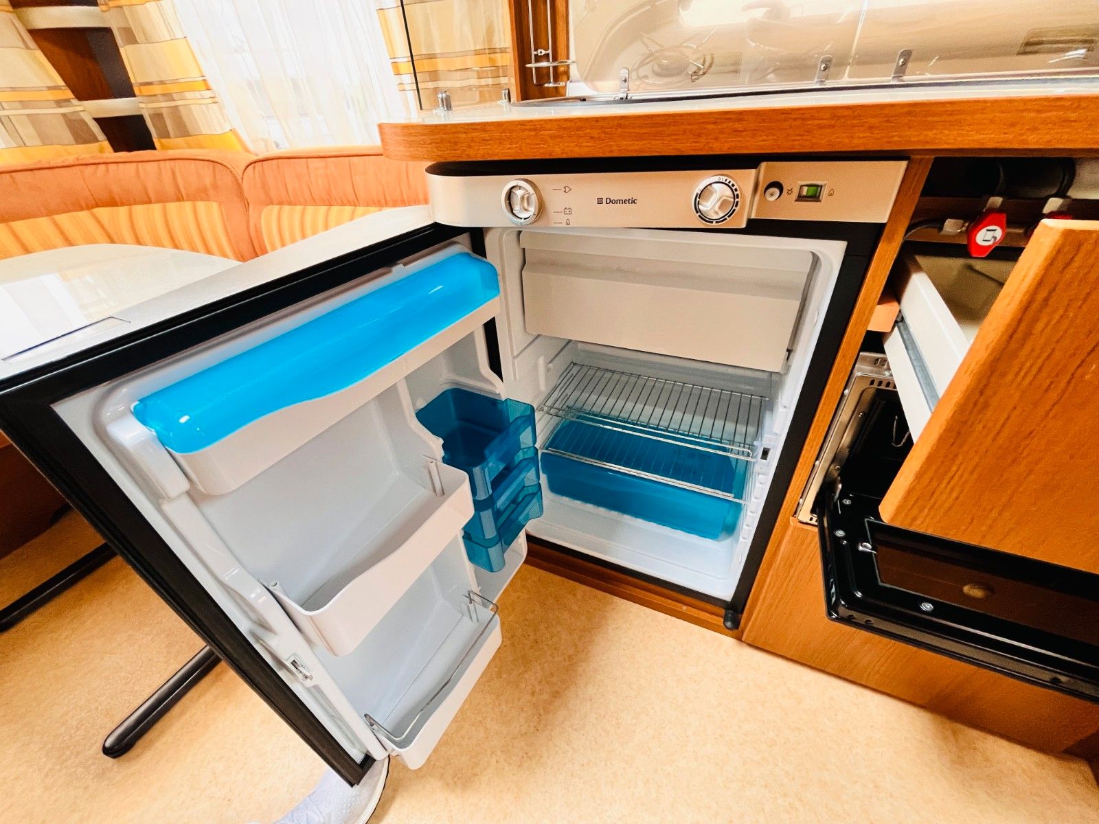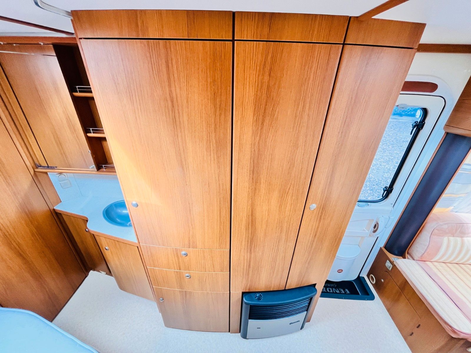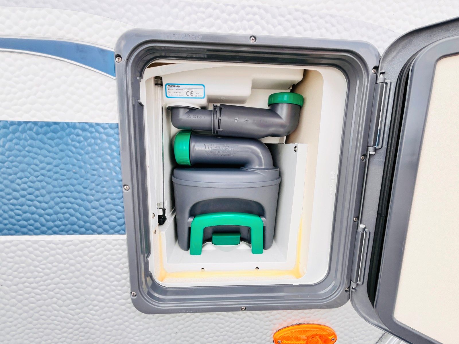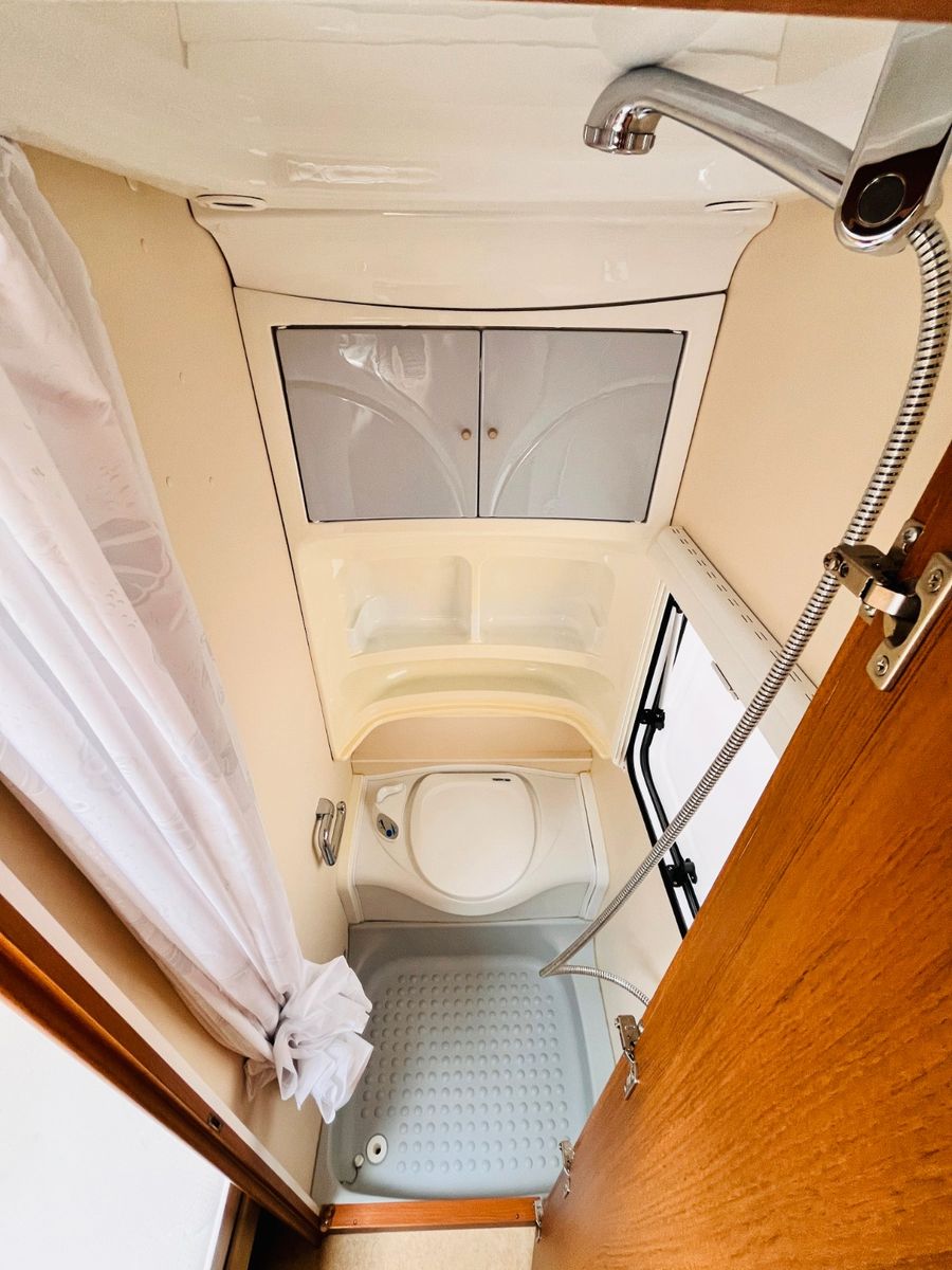 – Bad mit außenliegendem Waschbecken, Fenster, Dusche und Thetford Cassettentoilette