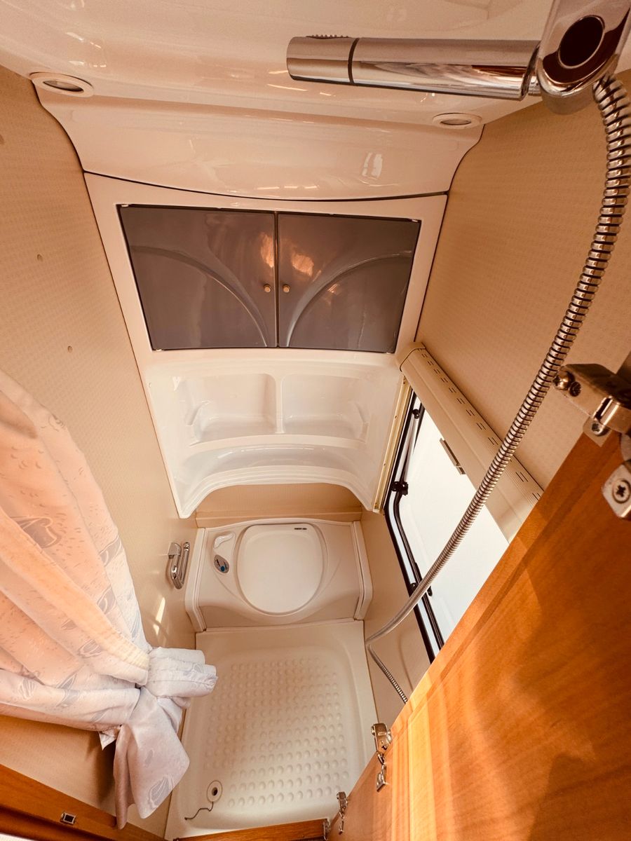 – Bad mit Waschbecken, Fenster, Dusche und Thetford-Cassettentoilette