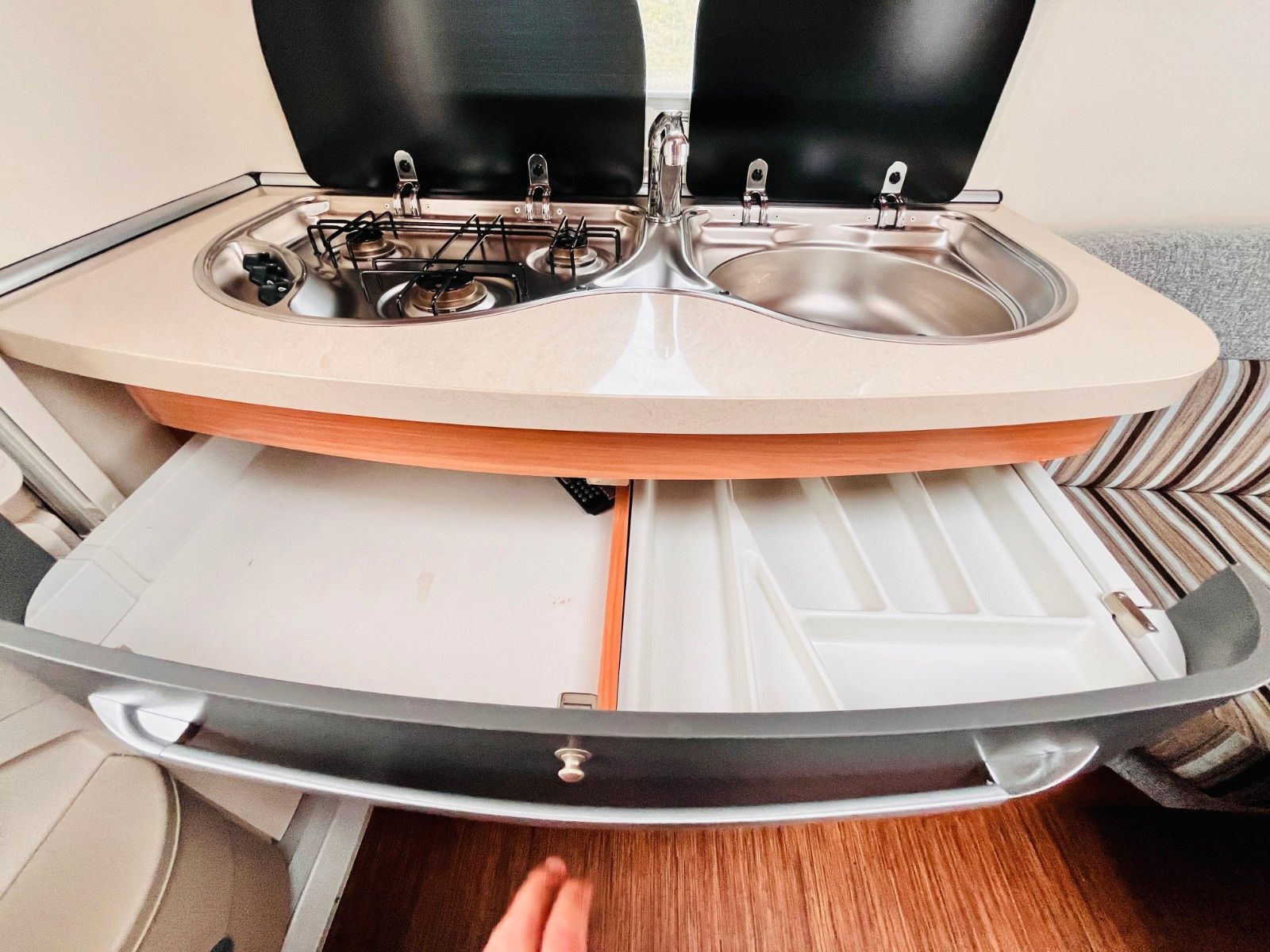 – Heckküche mit Stauraum, Spüle und 3-Flammenkocher