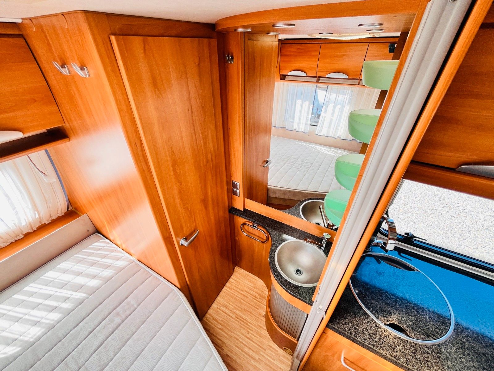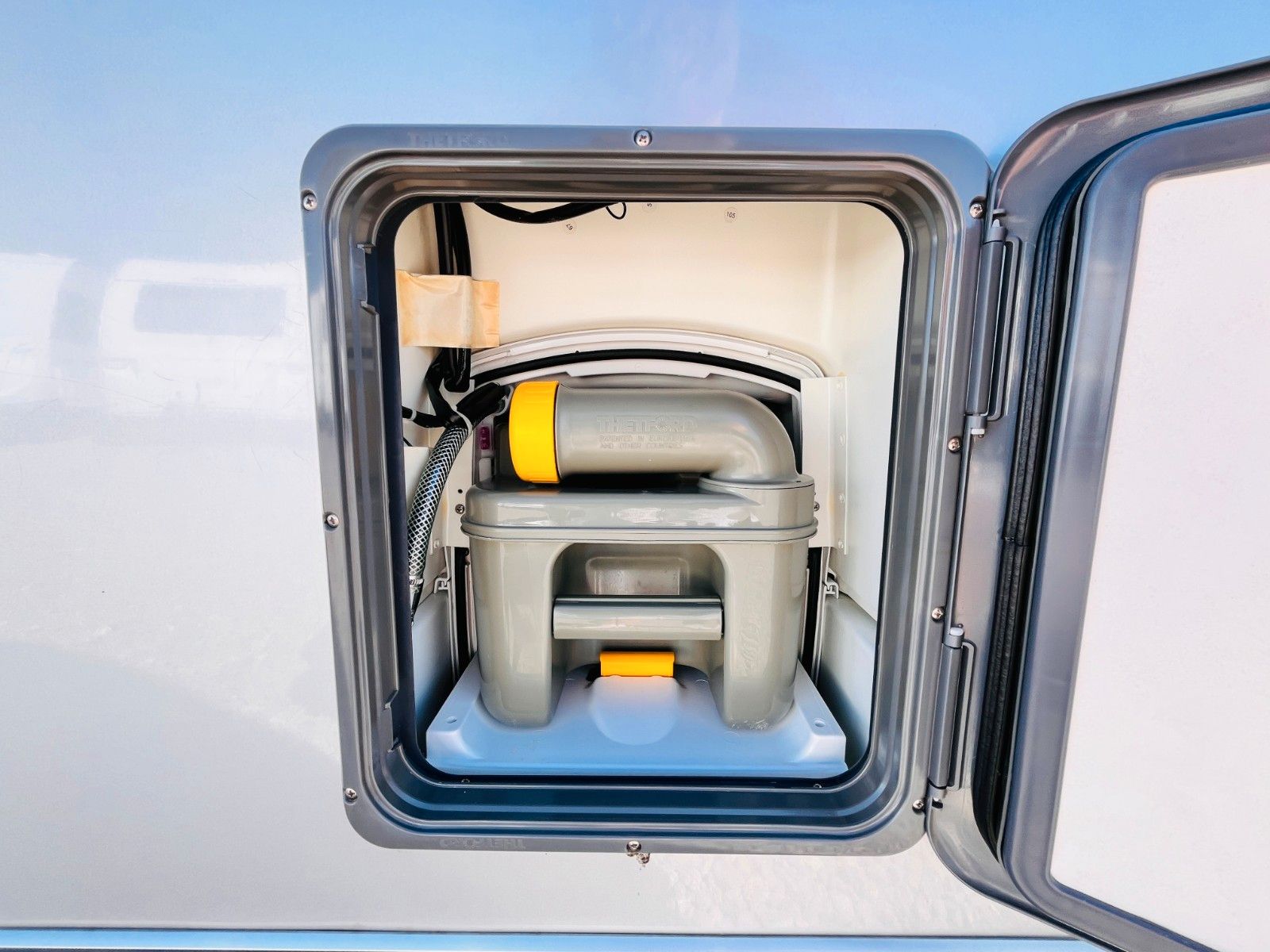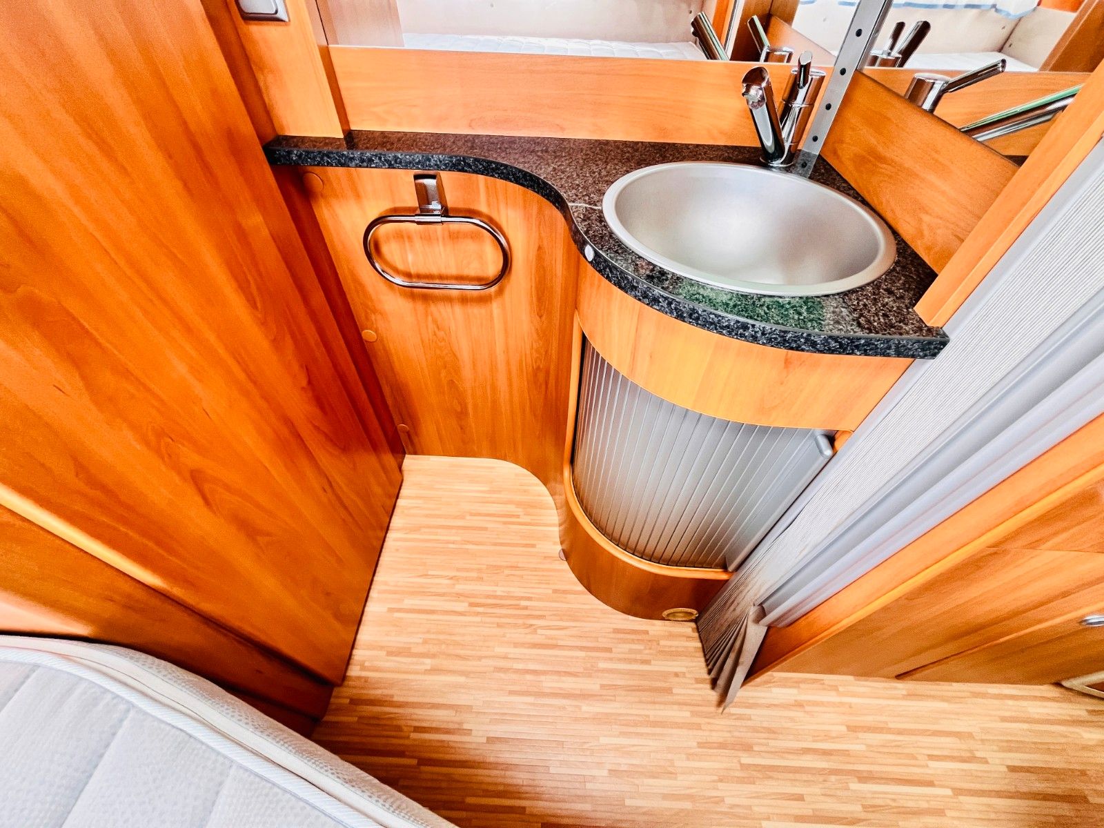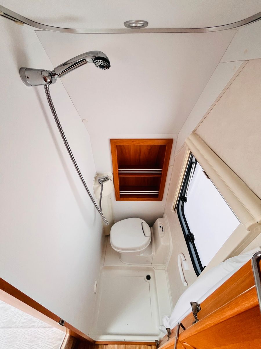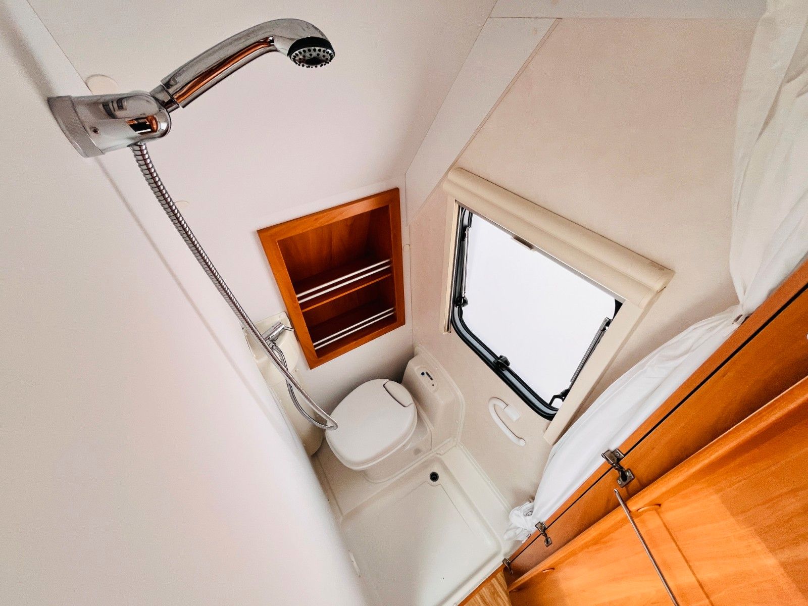 – Bad mit außenliegendem Waschbecken, Fenster, Dusche und Thetford-Cassettentoilette