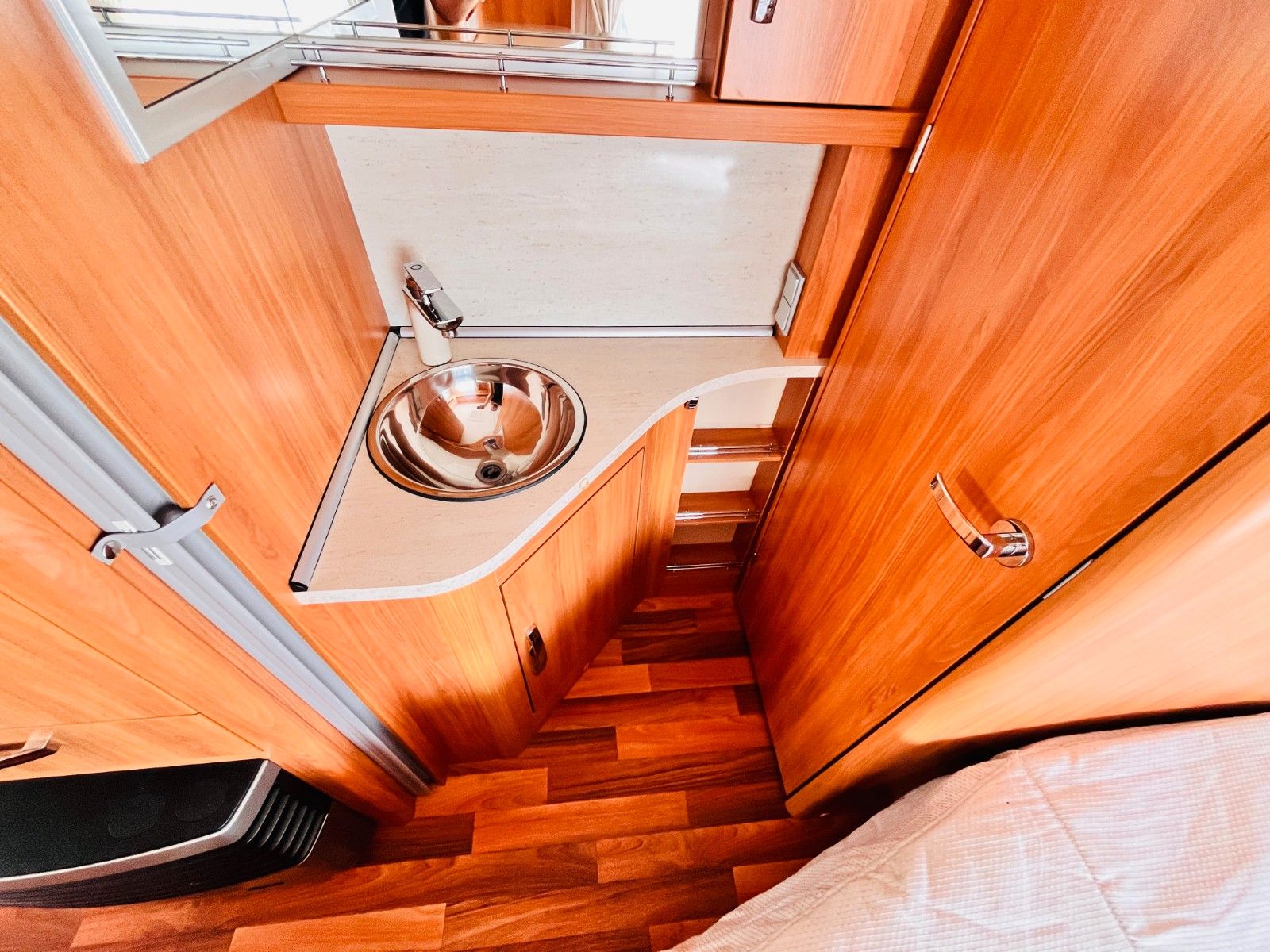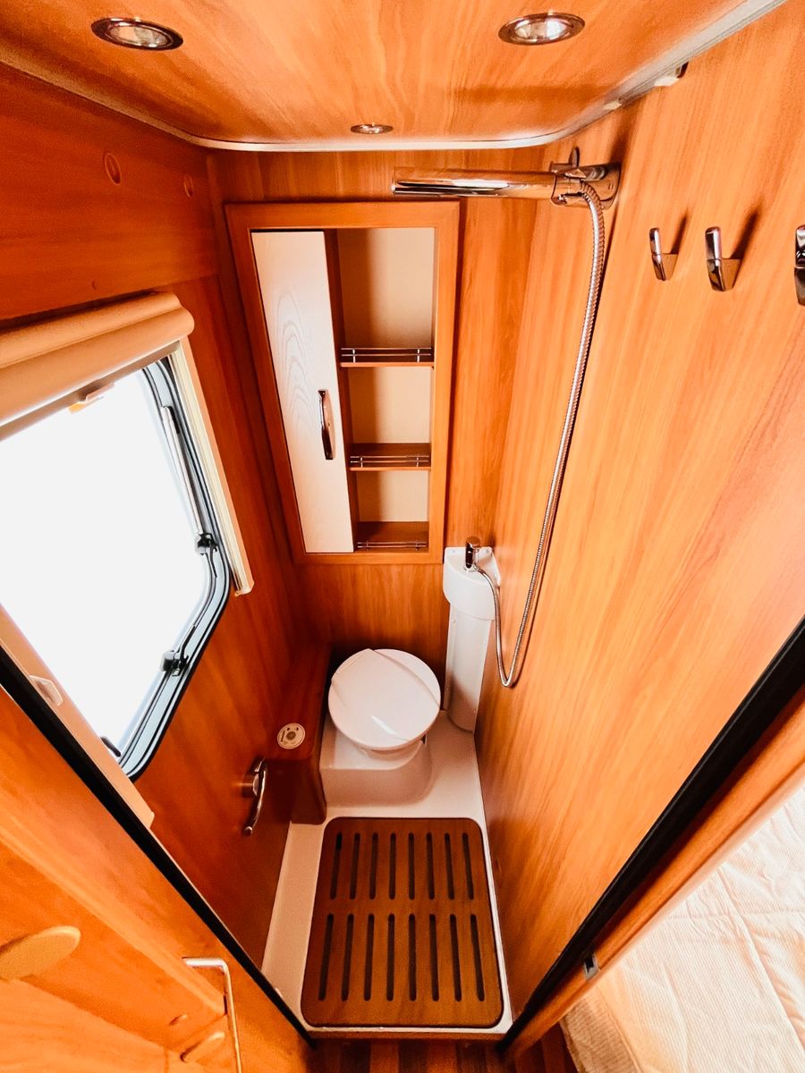 – Bad mit außenliegendem Waschbecken, Fenster, Dusche und Thetford Cassettentoilette